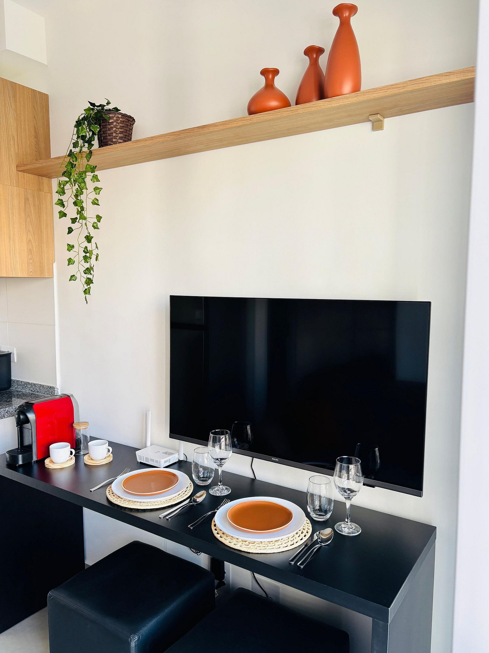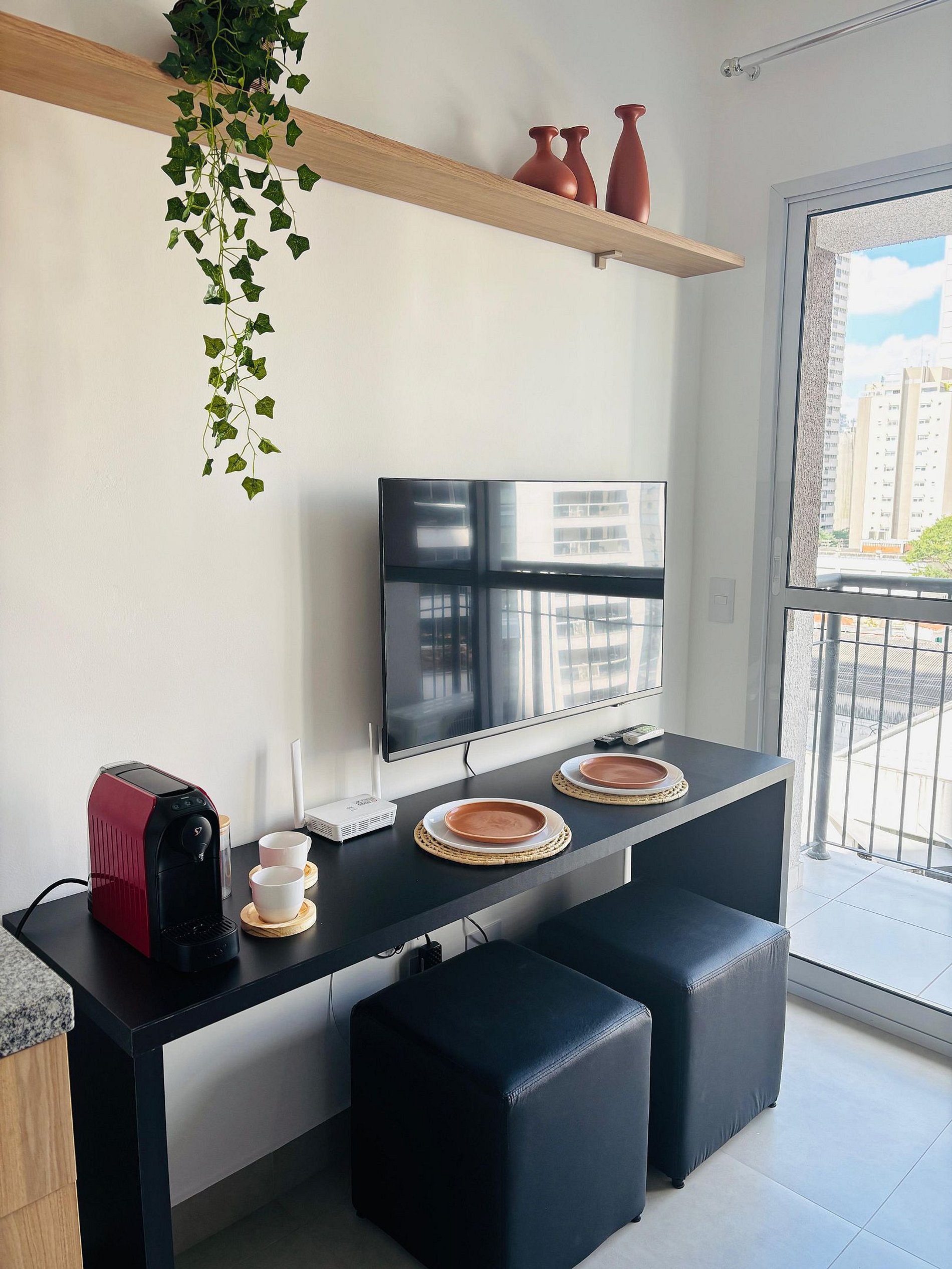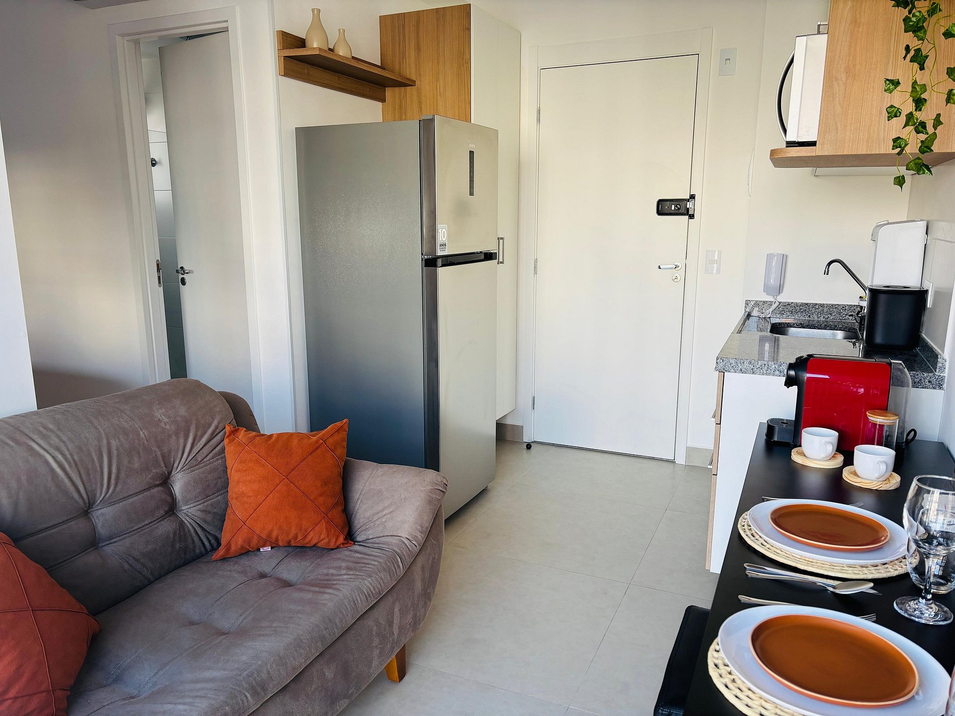 O estúdio está equipados com cama de casal, Smart TV, Wi-Fi , ar-condicionado, secador de cabelo, steamer portátil, cozinha com mesa de apoio, micro-ondas, frigobar, fogão por indução, máquina de café em cápsula, filtro de água e louças básicas. Além disso, o condomínio possui piscina, academia e lavanderia.