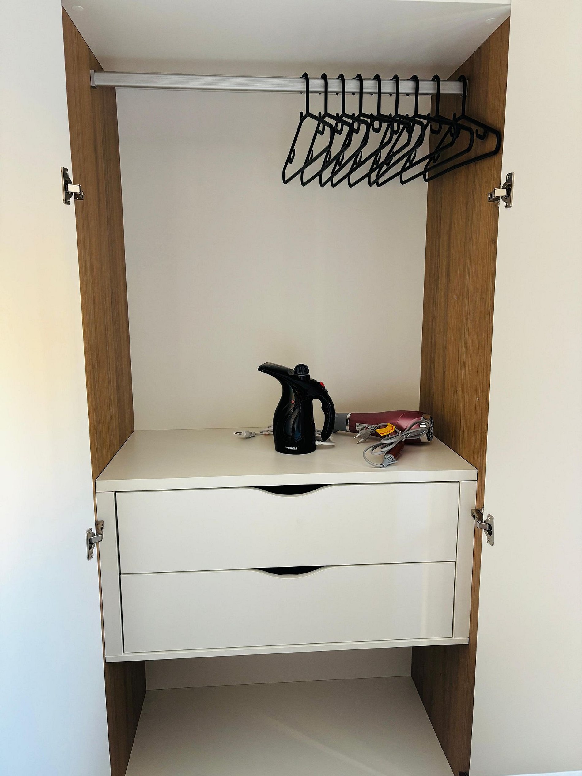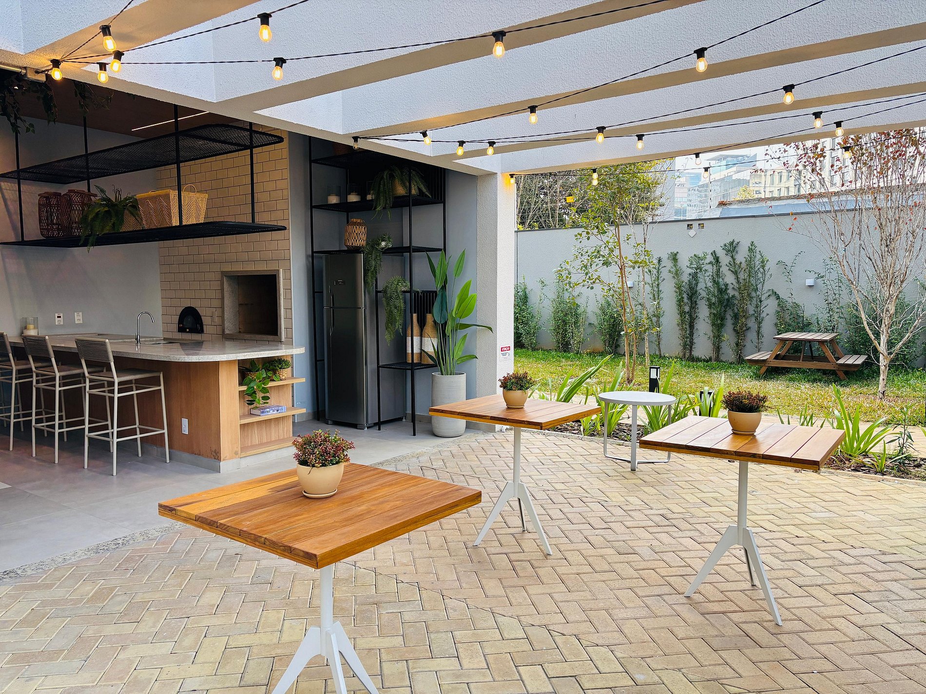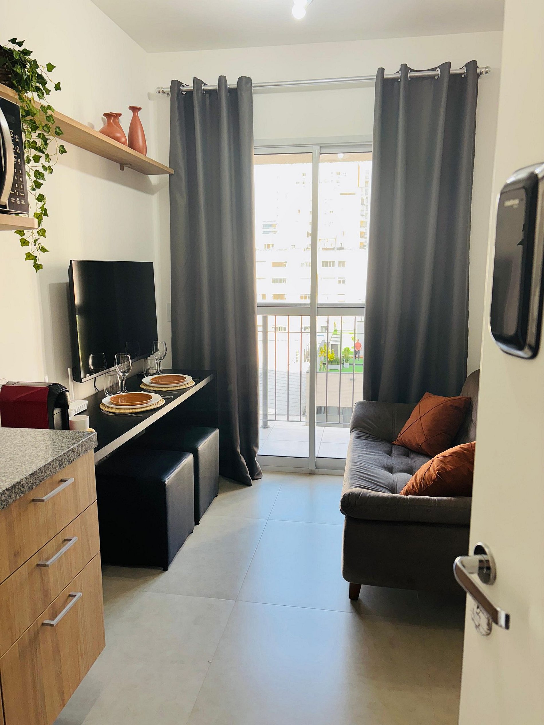 O estúdio está equipados com cama de casal, Smart TV, Wi-Fi , ar-condicionado, secador de cabelo, steamer portátil, cozinha com mesa de apoio, micro-ondas, frigobar, fogão por indução, máquina de café em cápsula, filtro de água e louças básicas. Além disso, o condomínio possui piscina, academia e lavanderia.