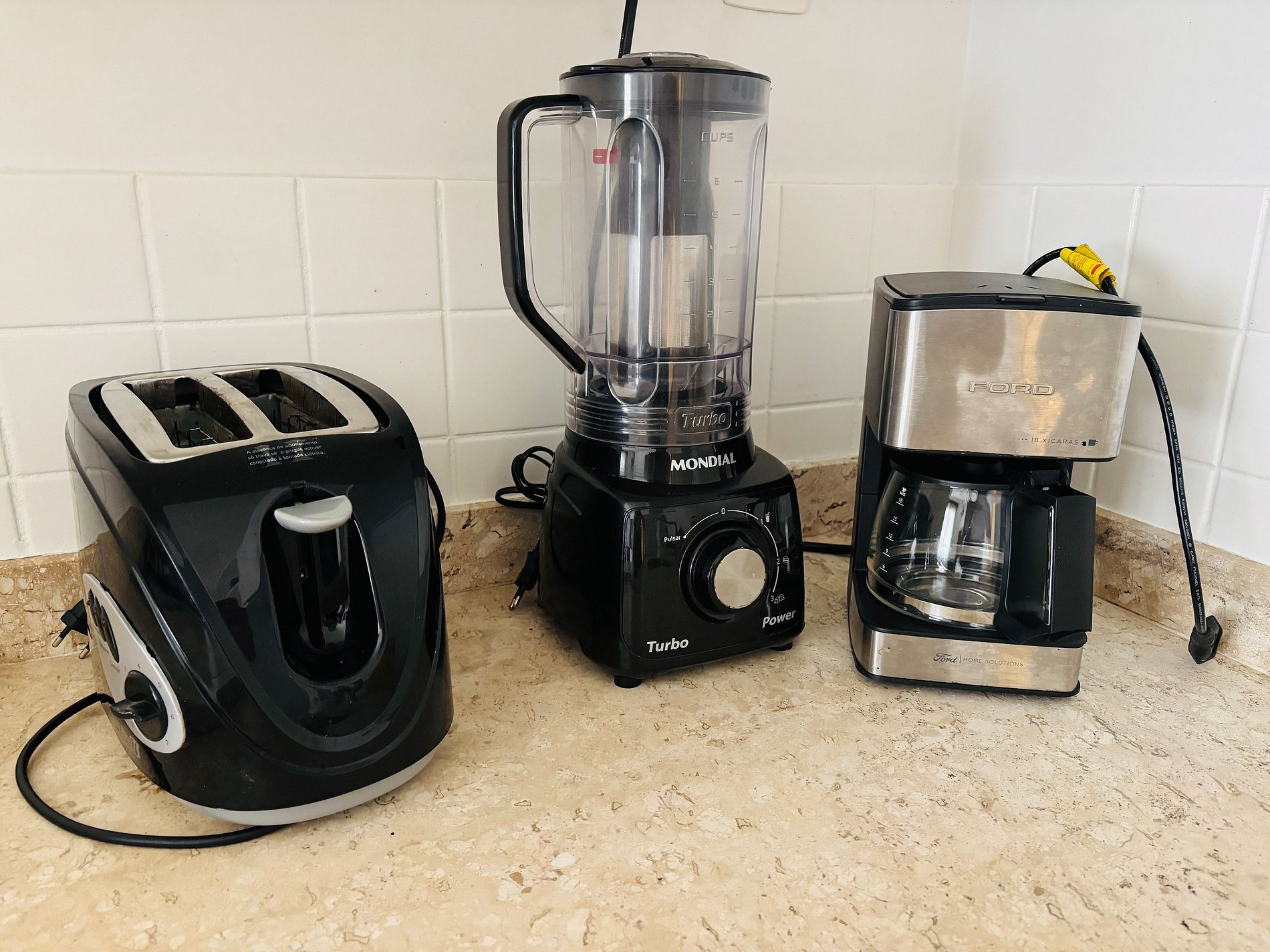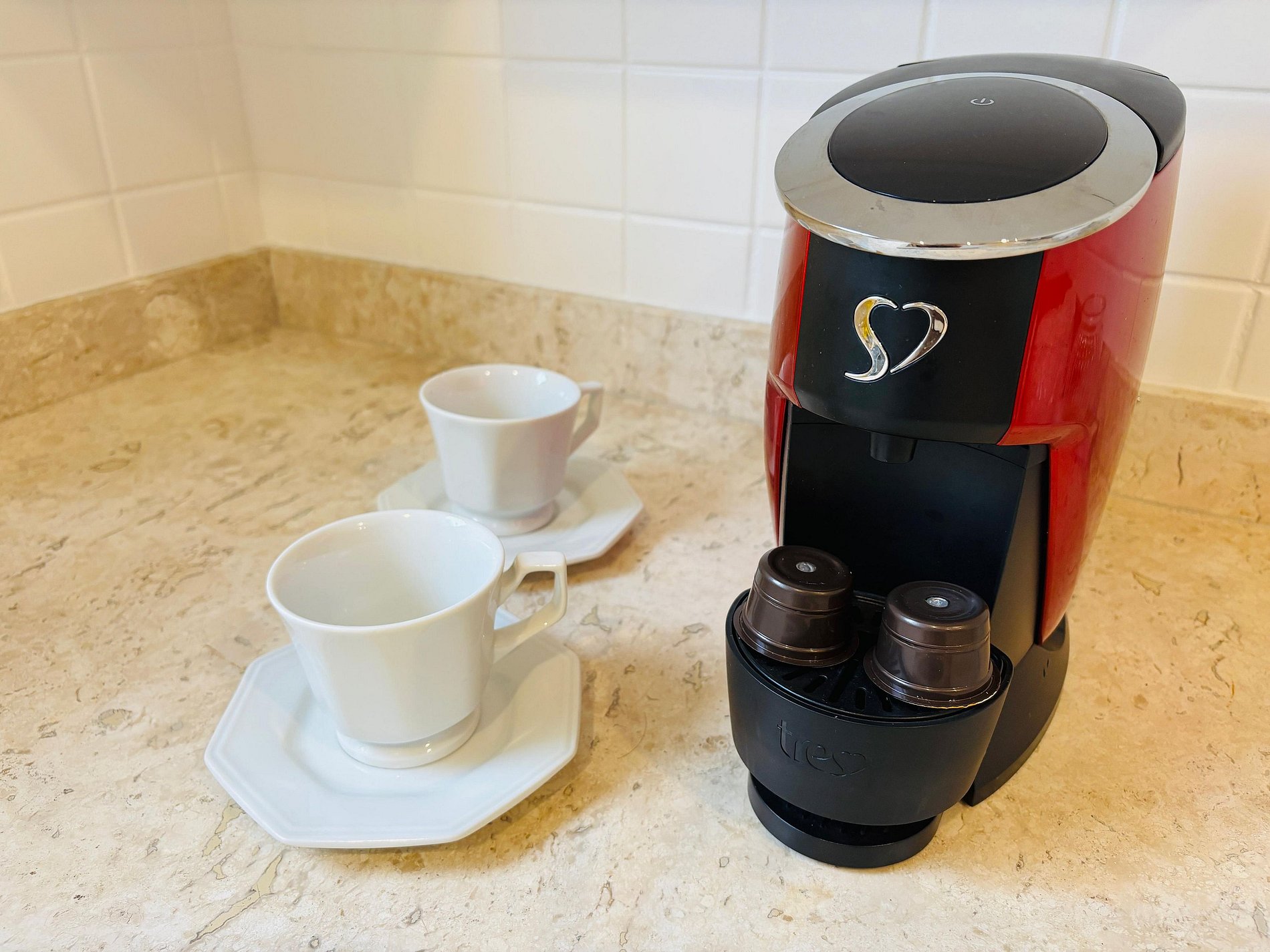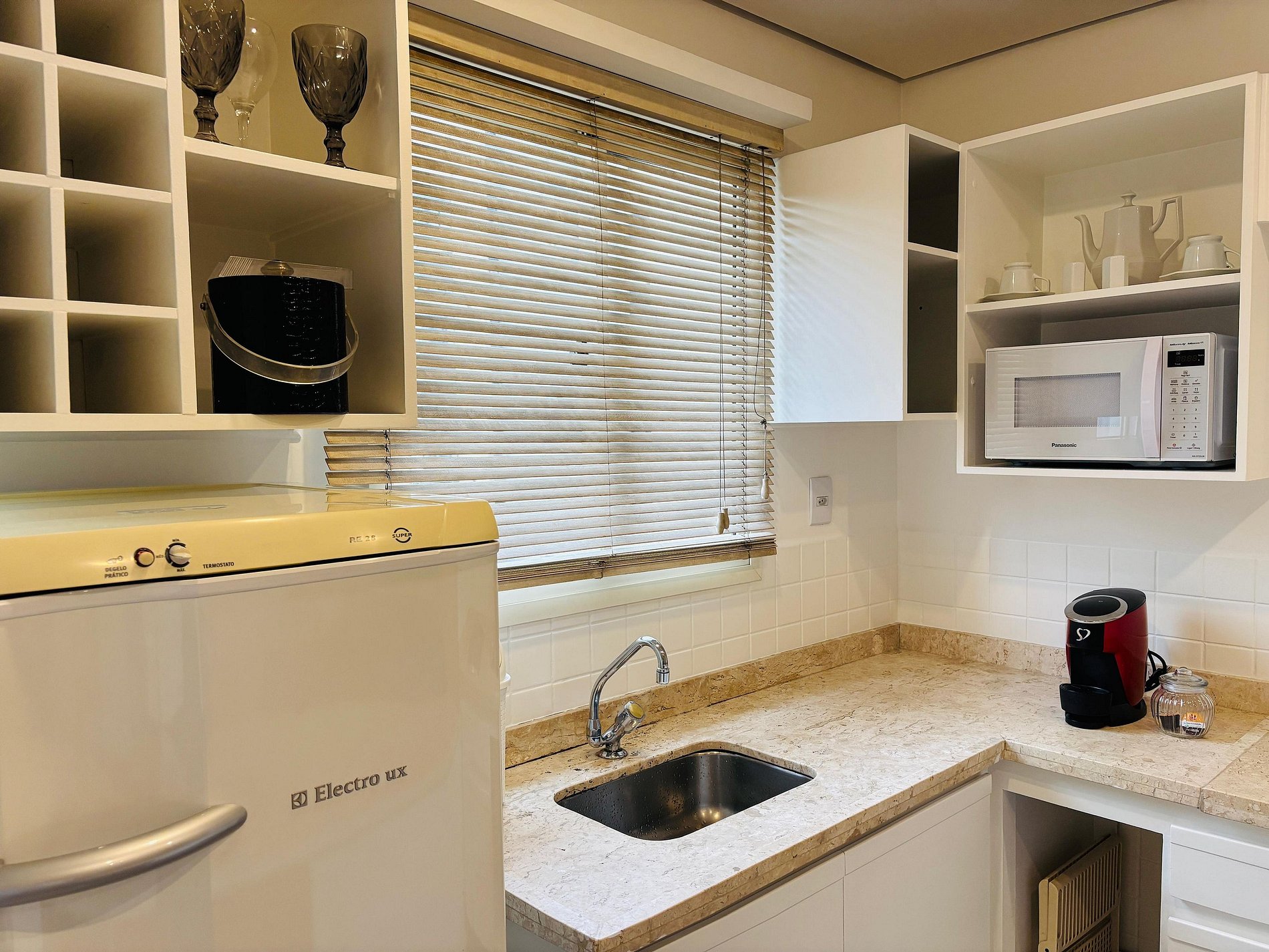 - Cozinha com micro-ondas, geladeira, cafeteira 3 Corações, pratos, copos e talheres