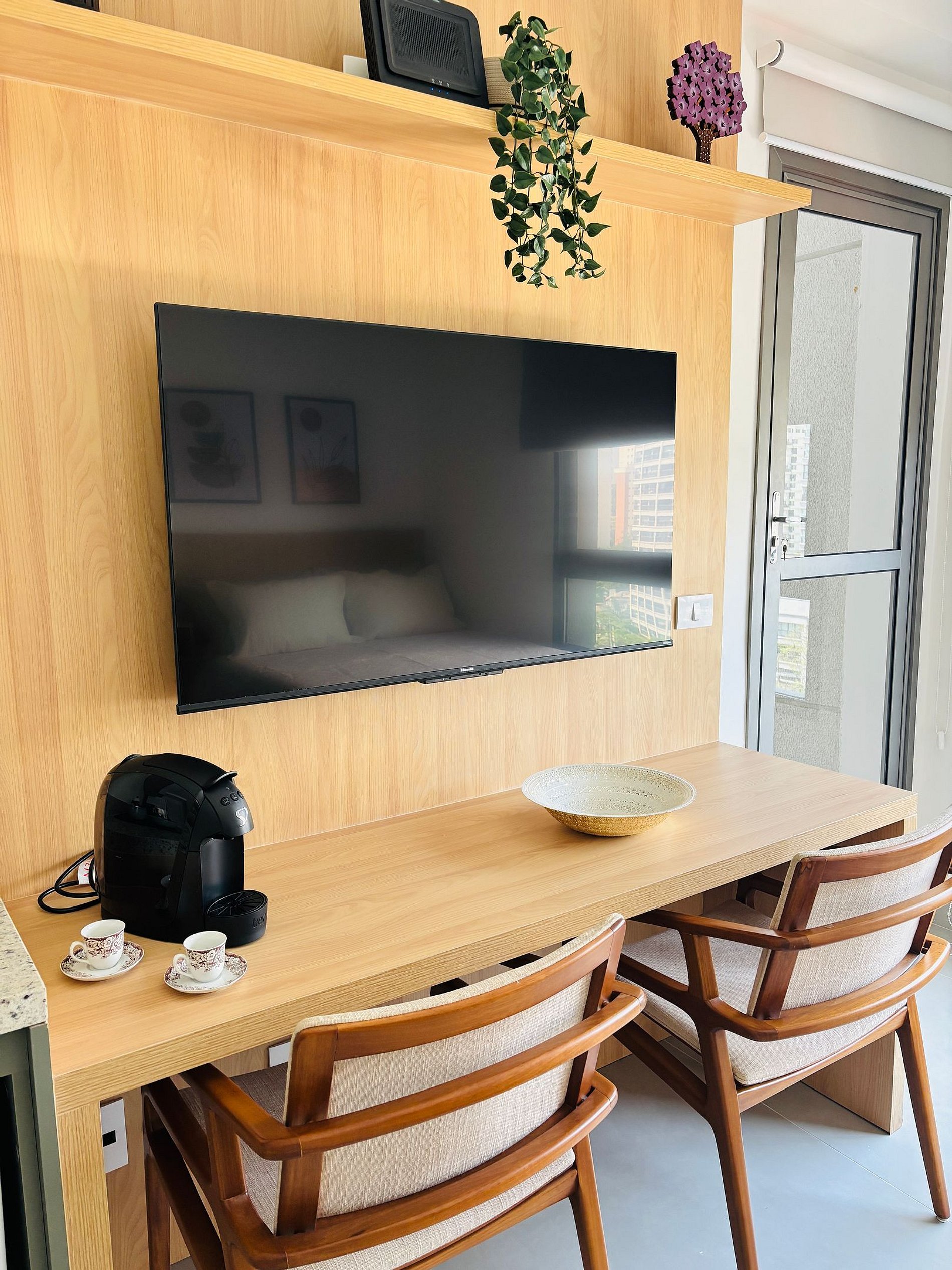 Os estúdios são equipados com cama de casal, Smart TV, Wi-Fi , ar-condicionado, secador de cabelo, ferro de passar roupa, cozinha com mesa de apoio, micro-ondas, geladeira, fogão por indução, máquina de café em cápsula, filtro de água e louças básicas. Além disso, o condomínio possui academia e área de churrasqueira.