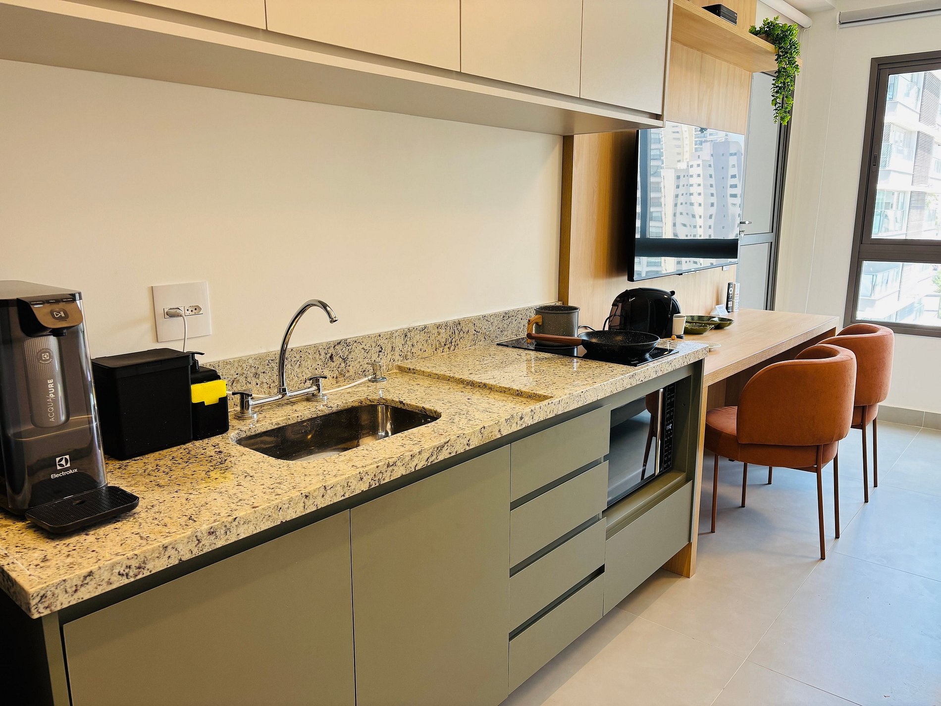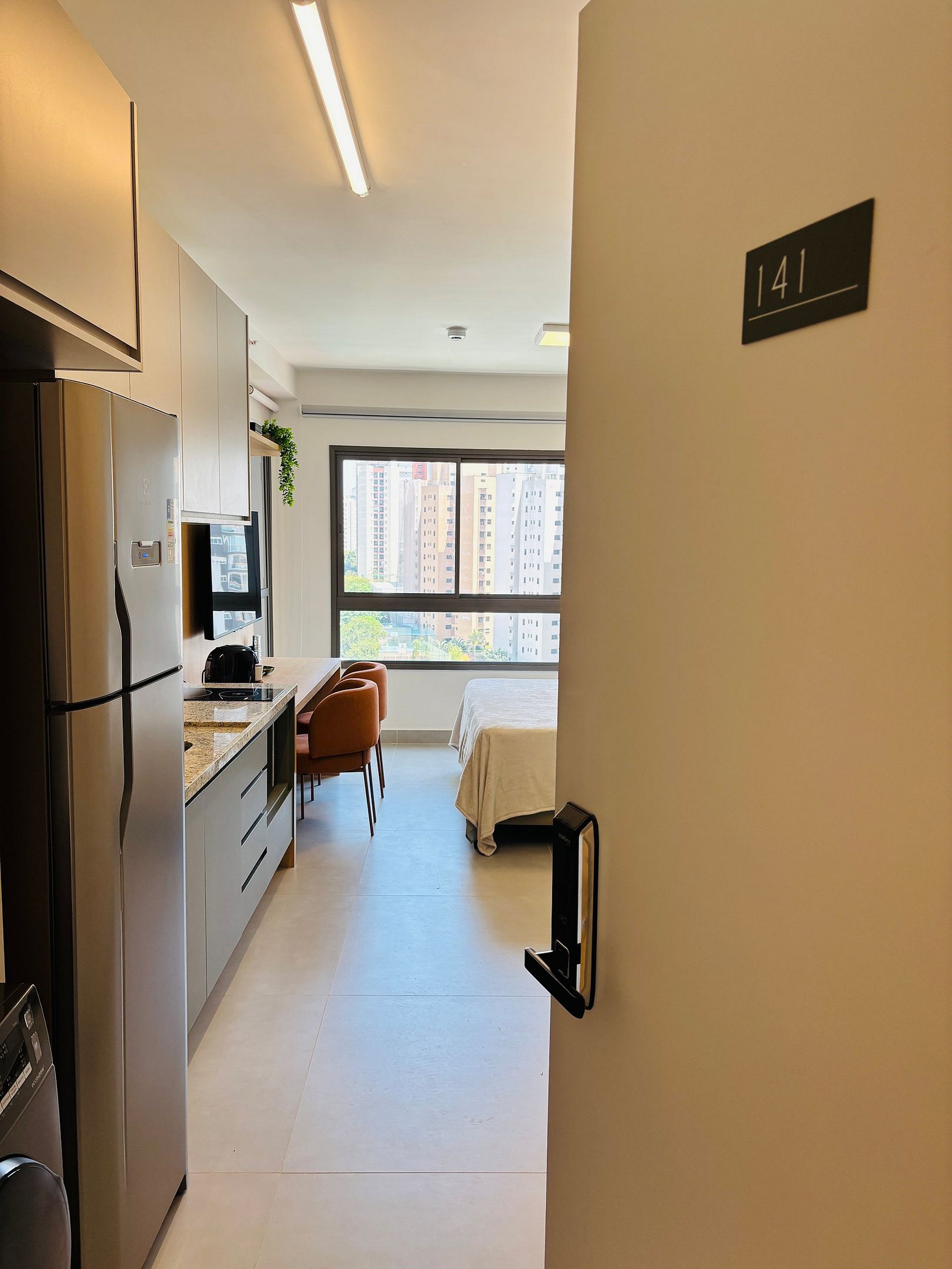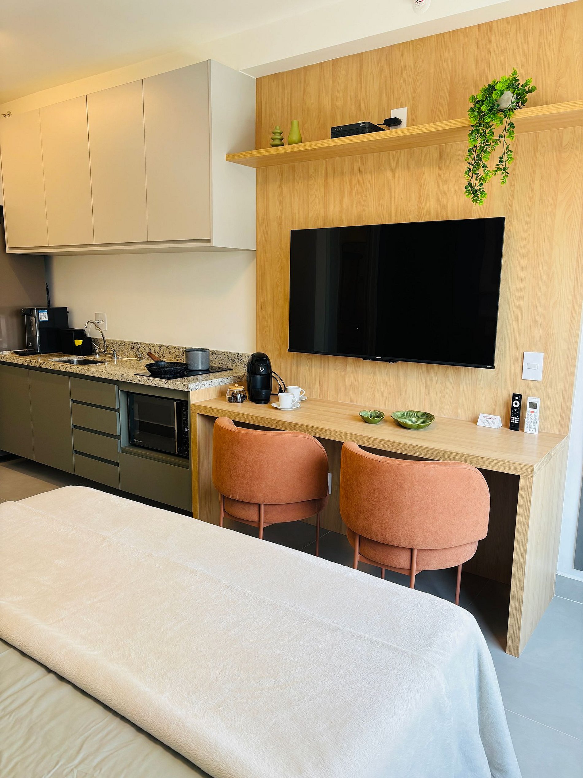 Os estúdios são equipados com cama de casal, Smart TV, Wi-Fi , ar-condicionado, secador de cabelo, ferro de passar roupa, cozinha com mesa de apoio, micro-ondas, geladeira, fogão por indução, máquina de café em cápsula, filtro de água e louças básicas. Além disso, o condomínio possui academia e área de churrasqueira.