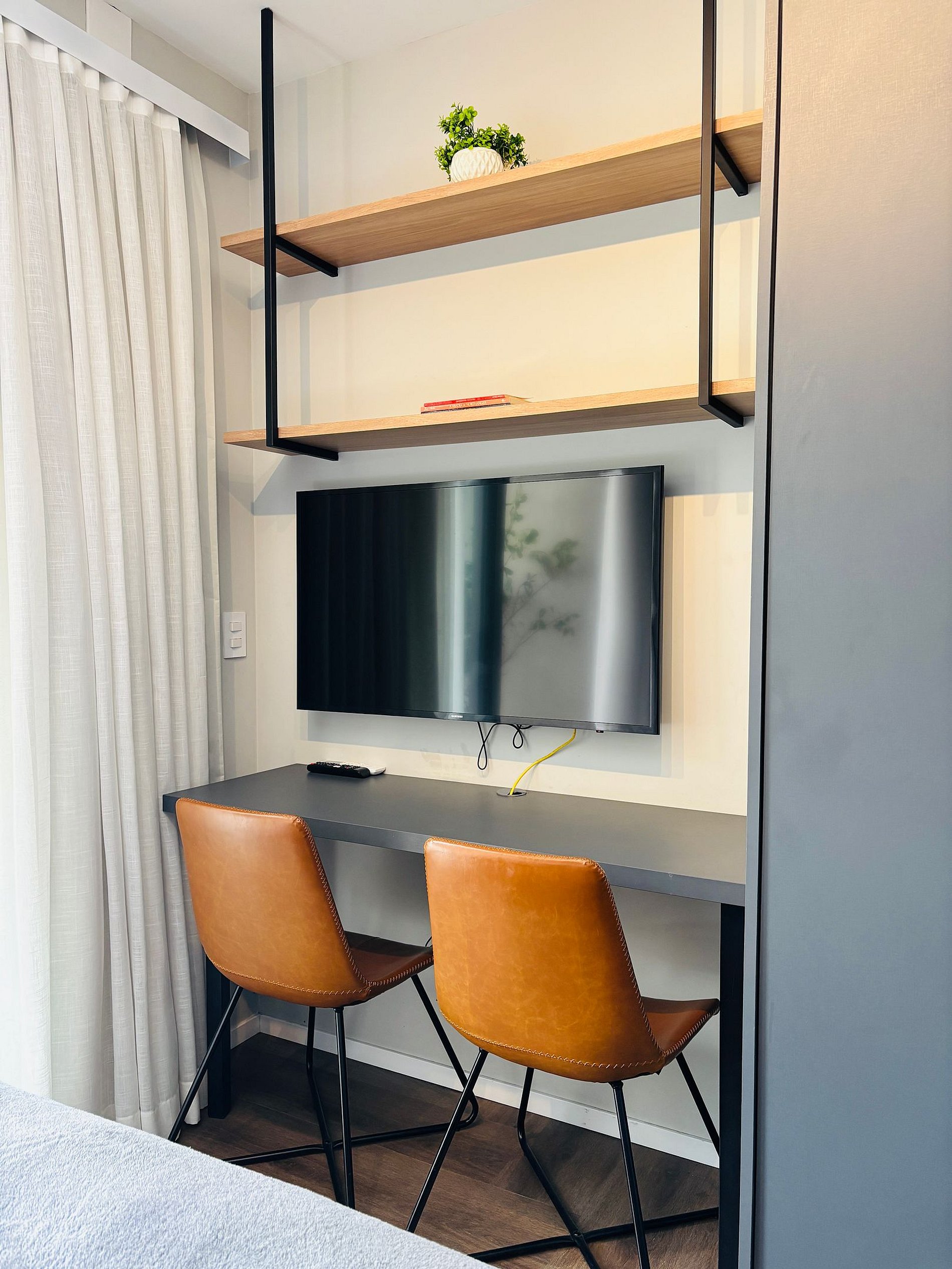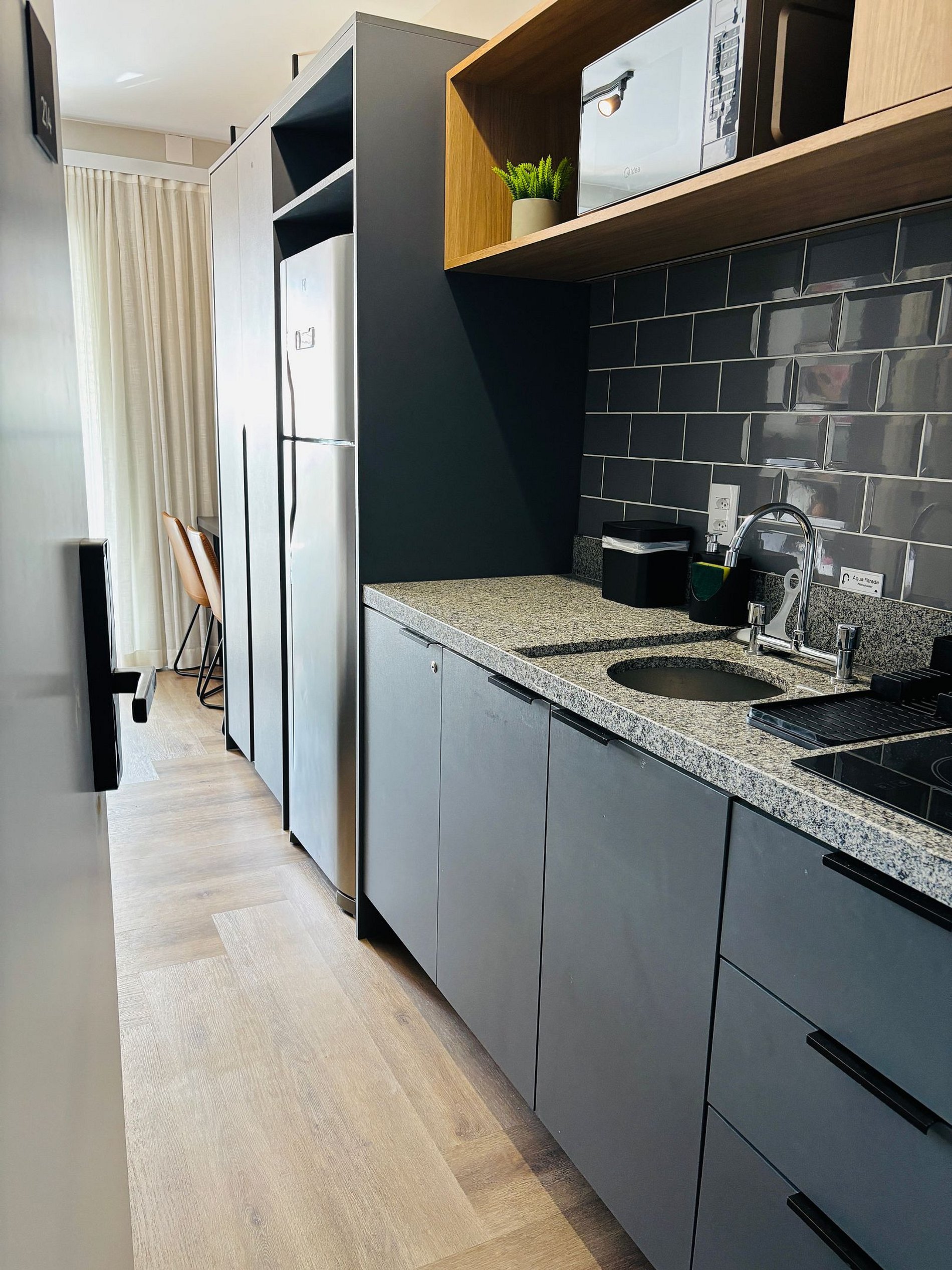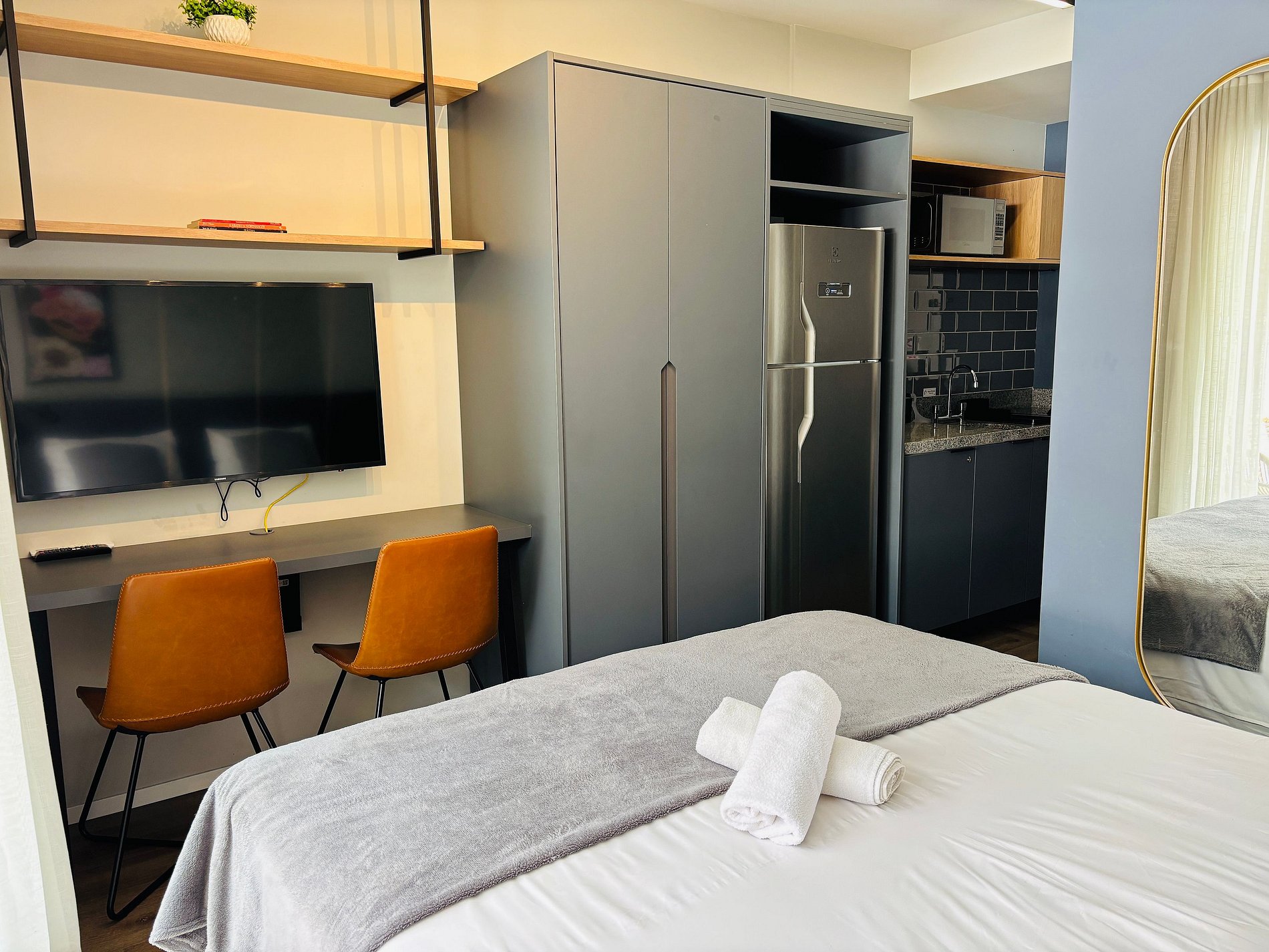 Os estúdios são equipados com cama queen, Smart TV, Wi-Fi , ar-condicionado, secador de cabelo, steamer portátil, cozinha com mesa de apoio, micro-ondas, geladeira, fogão por indução, máquina de café em cápsula, filtro de água e louças básicas. Além disso, o condomínio possui academia, piscina, cooworking, lavanderia e área de convivência com stand de conveniência.