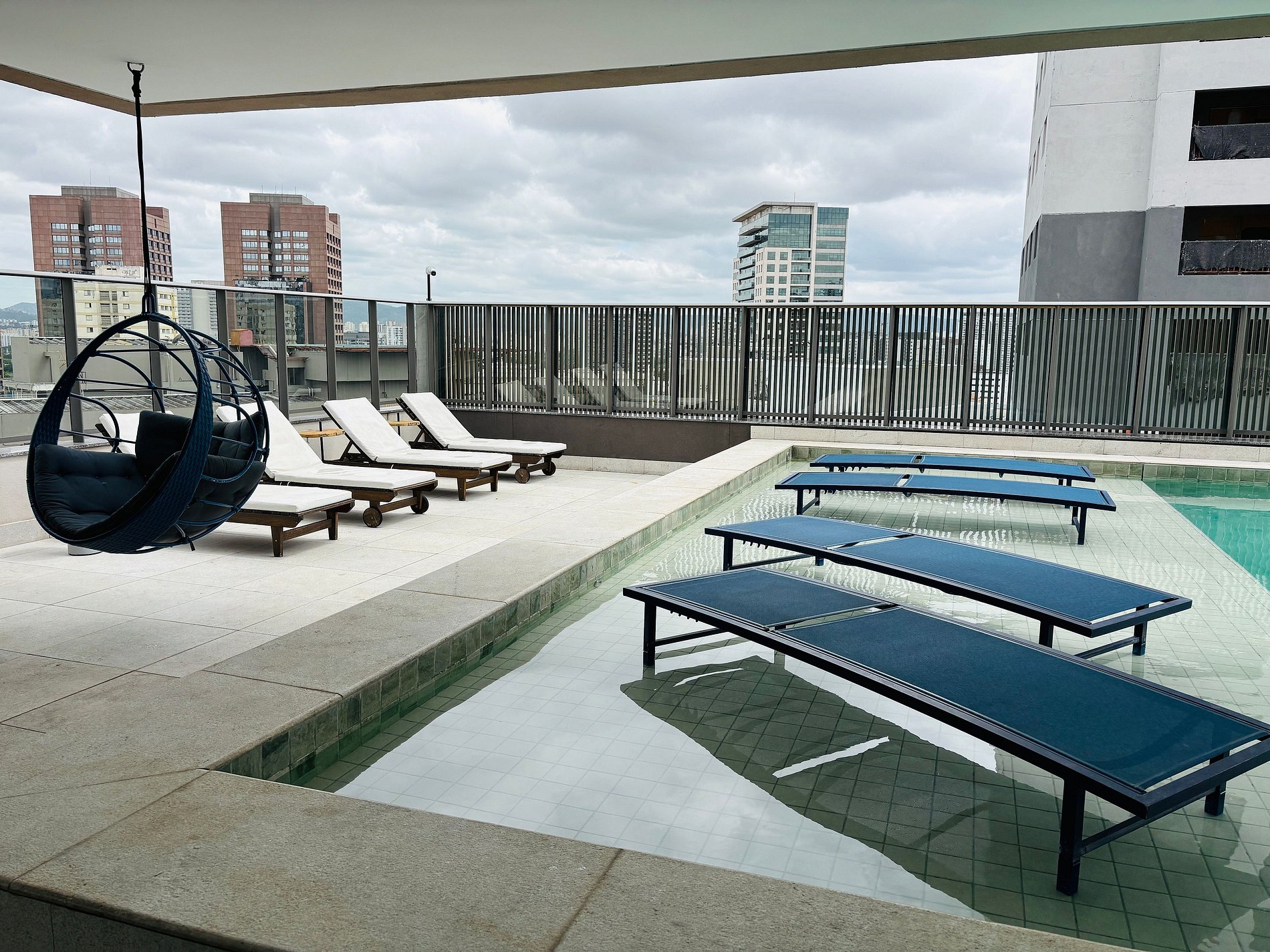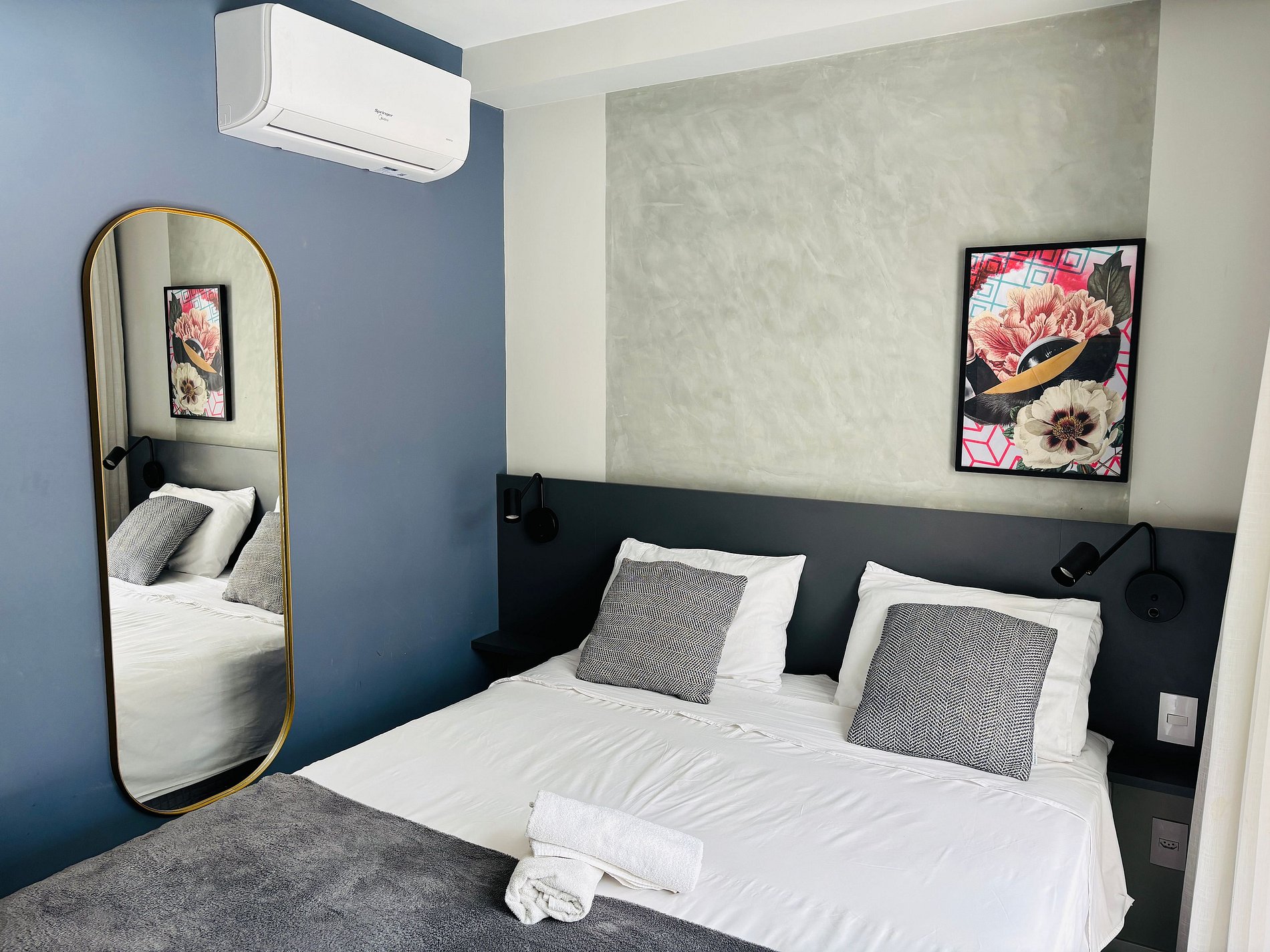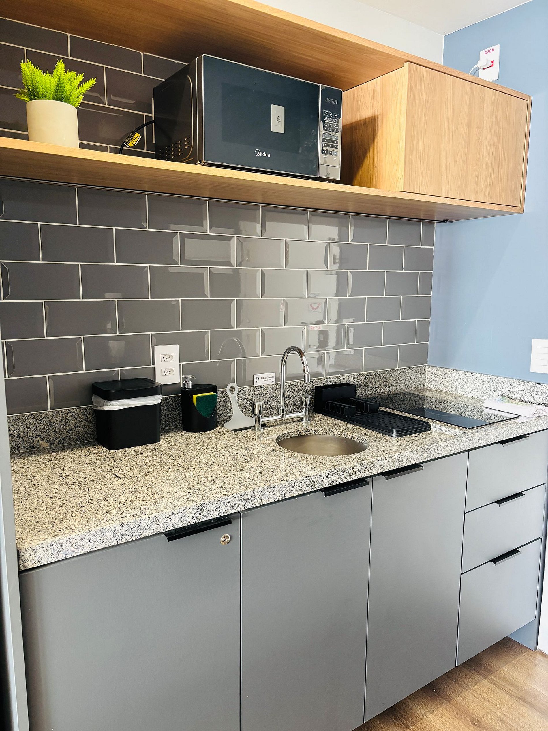 Os estúdios são equipados com cama queen, Smart TV, Wi-Fi , ar-condicionado, secador de cabelo, steamer portátil, cozinha com mesa de apoio, micro-ondas, geladeira, fogão por indução, máquina de café em cápsula, filtro de água e louças básicas. Além disso, o condomínio possui academia, piscina, cooworking, lavanderia e área de convivência com stand de conveniência.