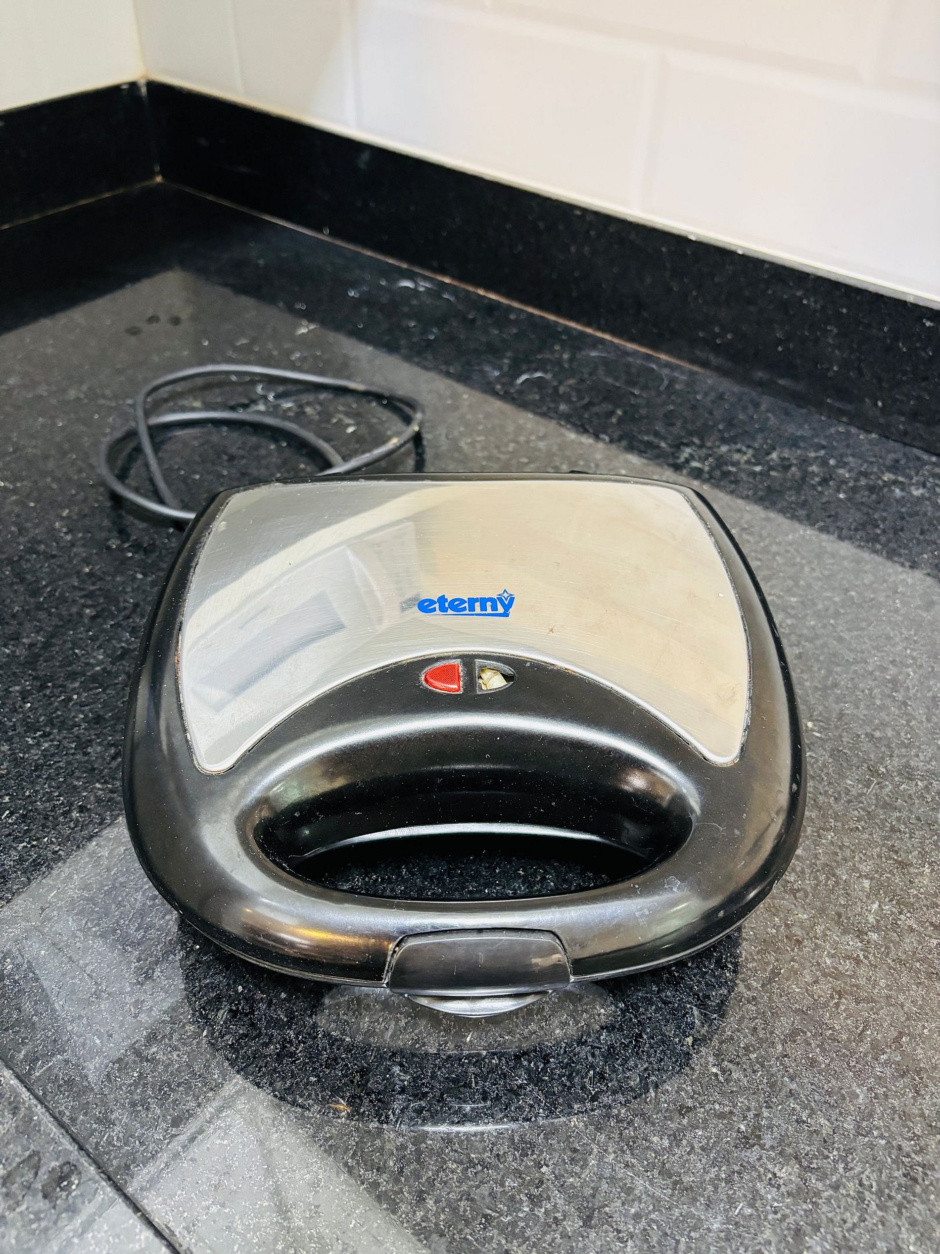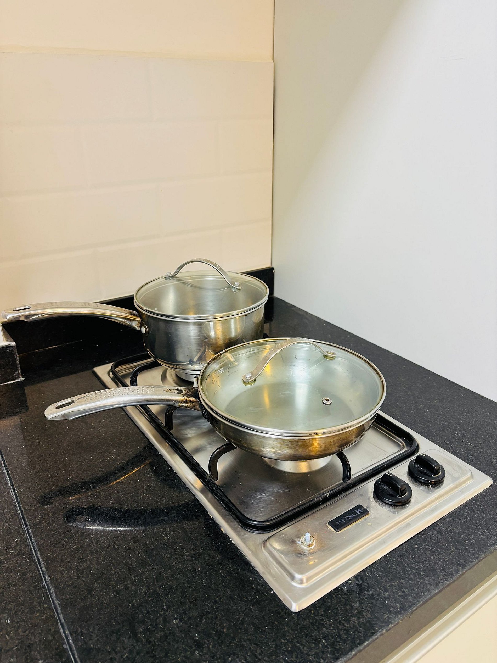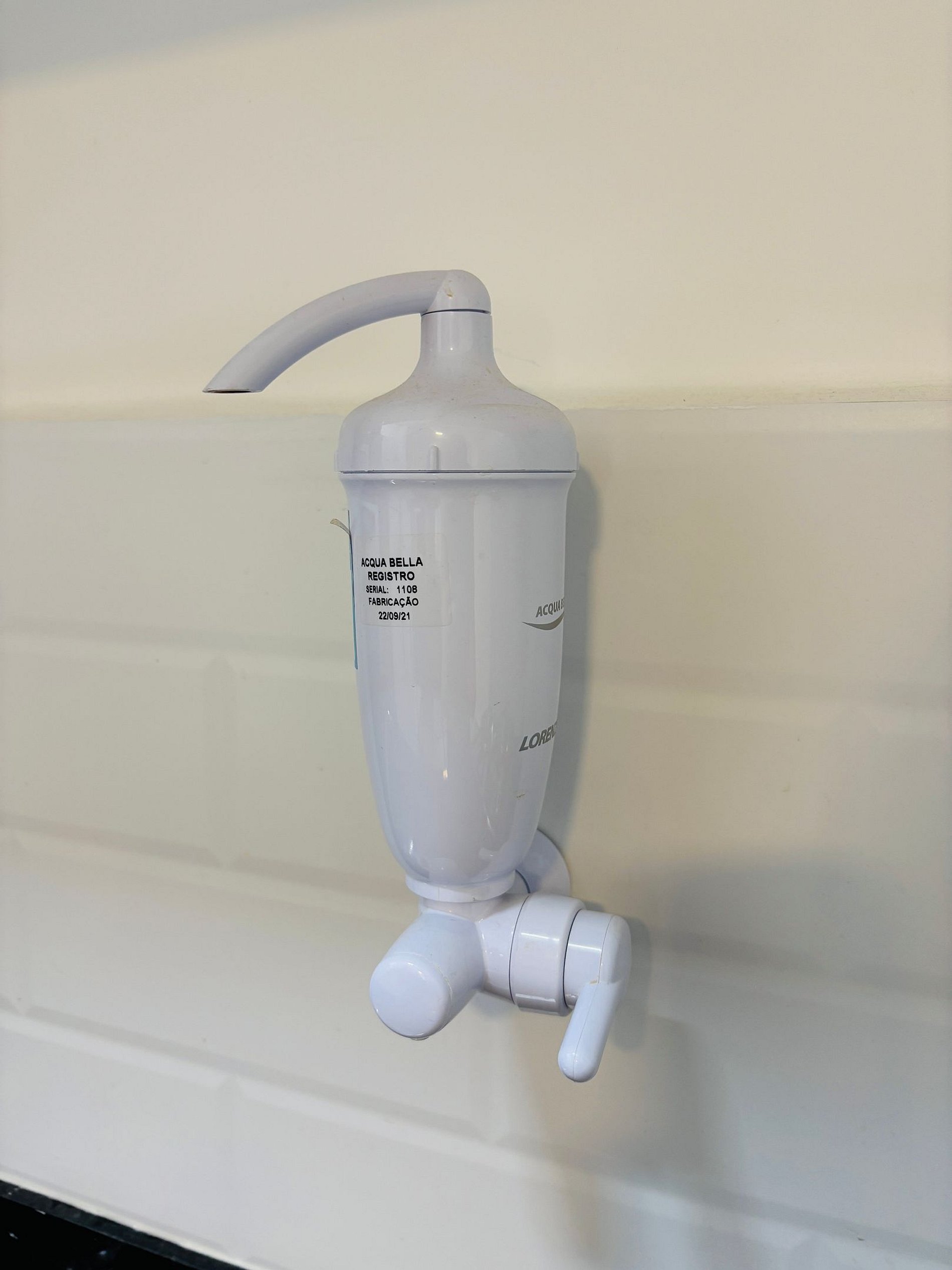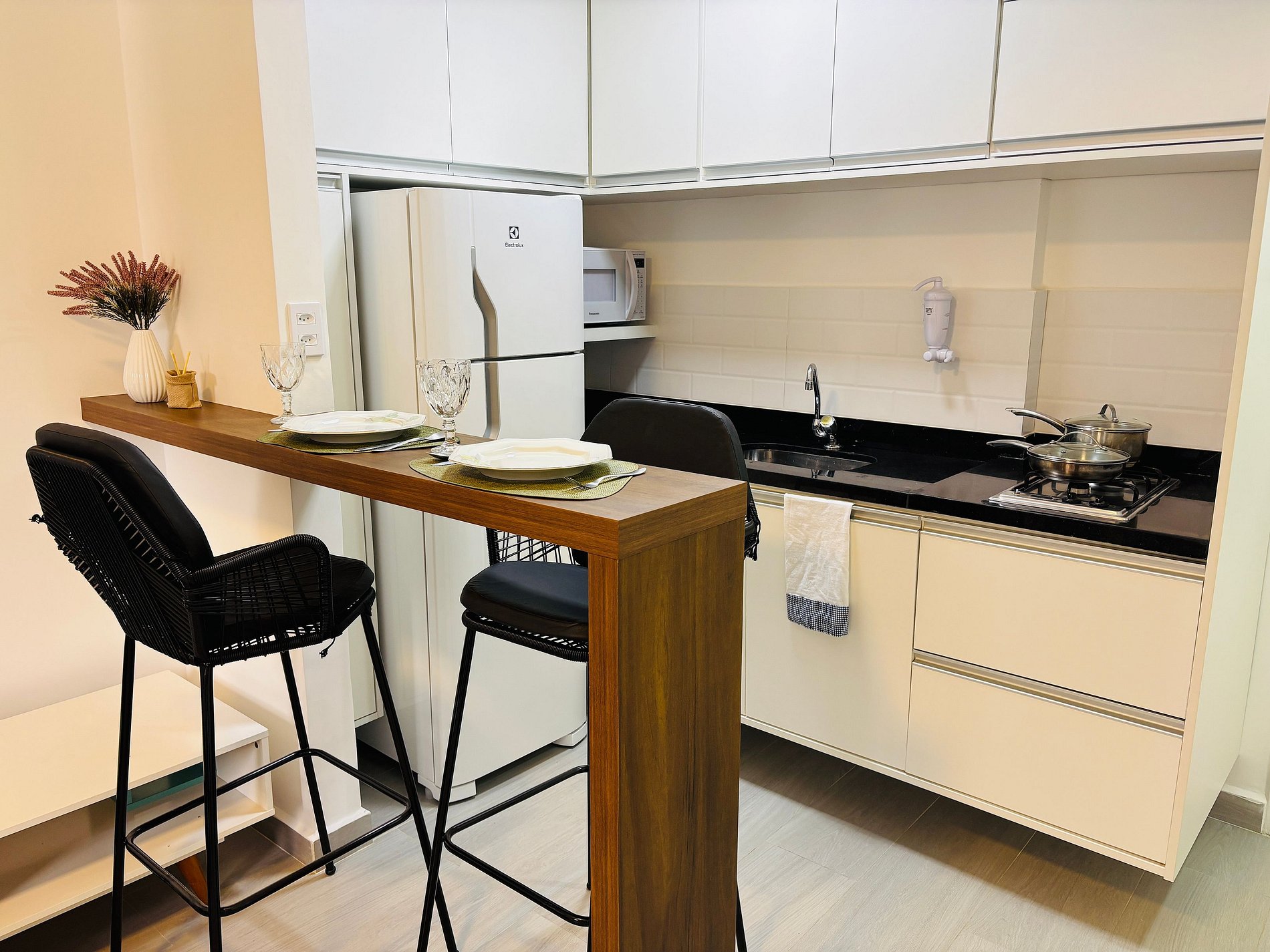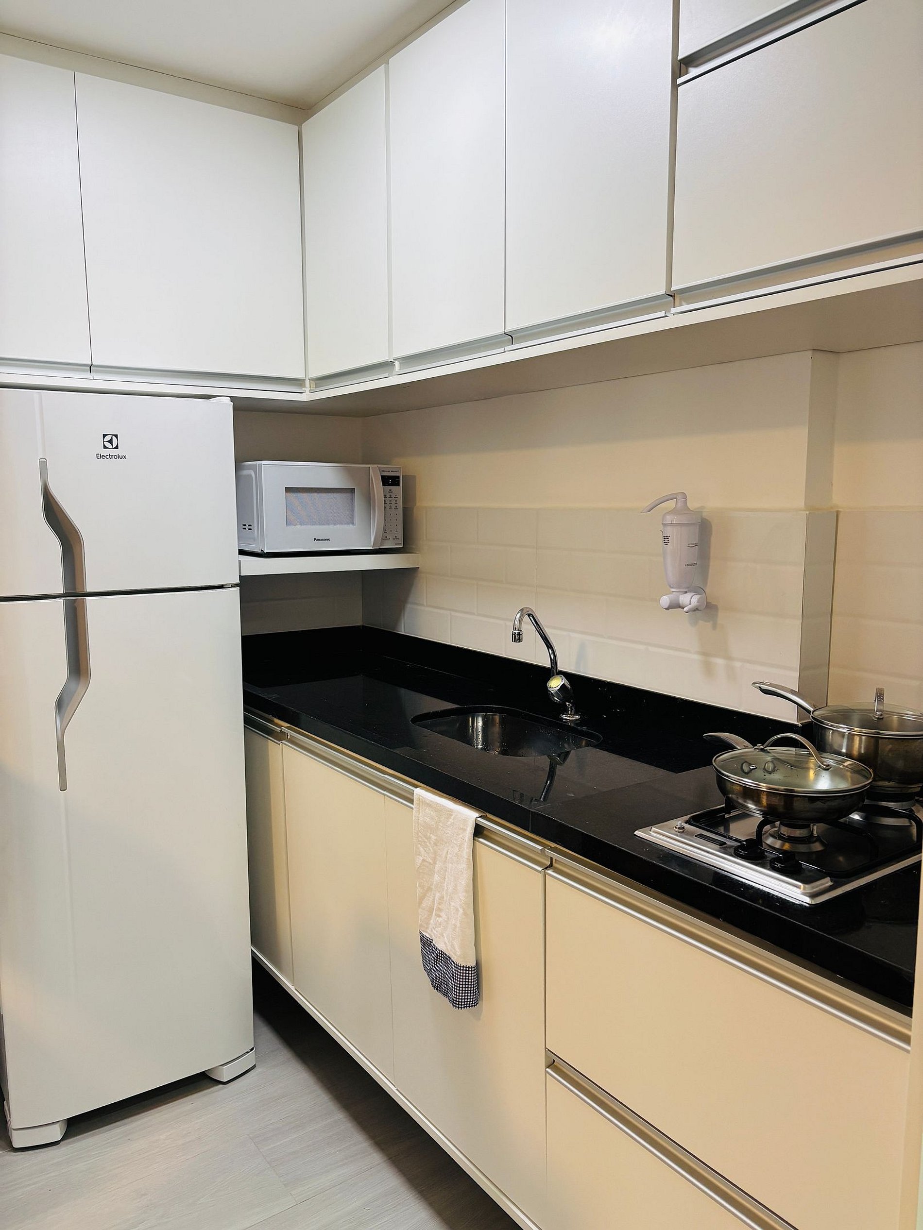 - Cozinha com micro-ondas, geladeira, fogão, sanduicheira, filtro de água, pratos, copos e talheres