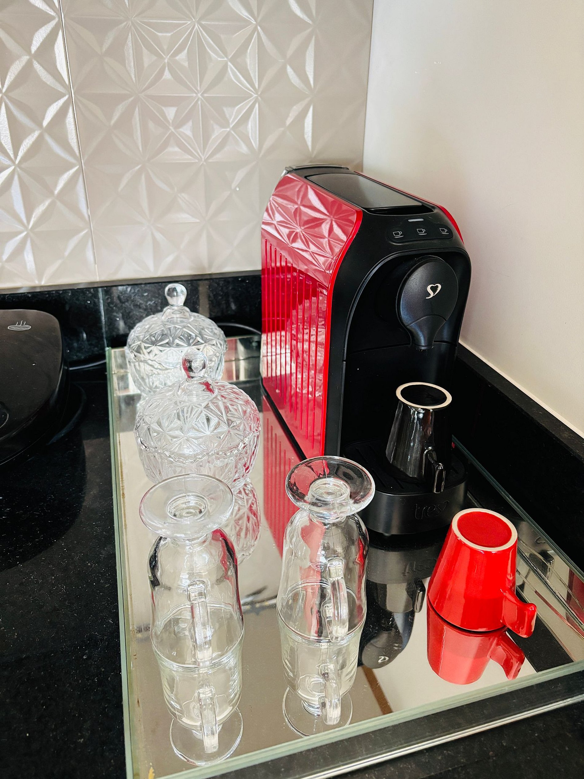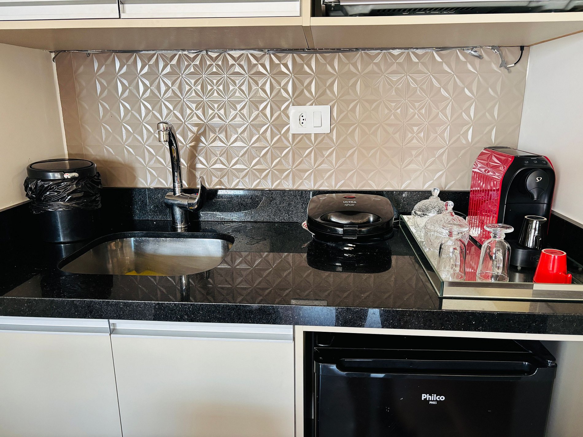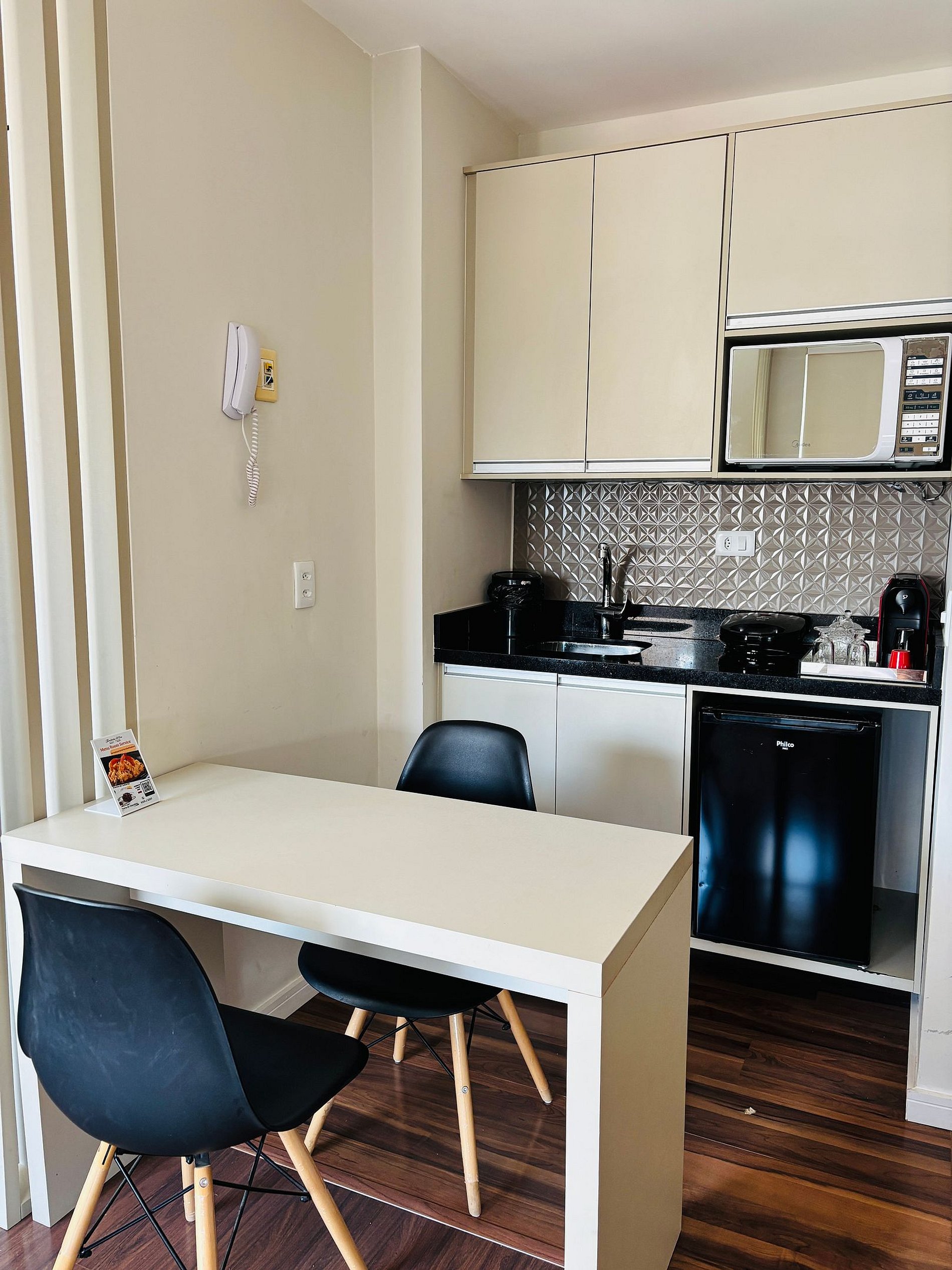 - Cozinha com micro-ondas, frigobar, cafeteira, pratos, copos e talheres
