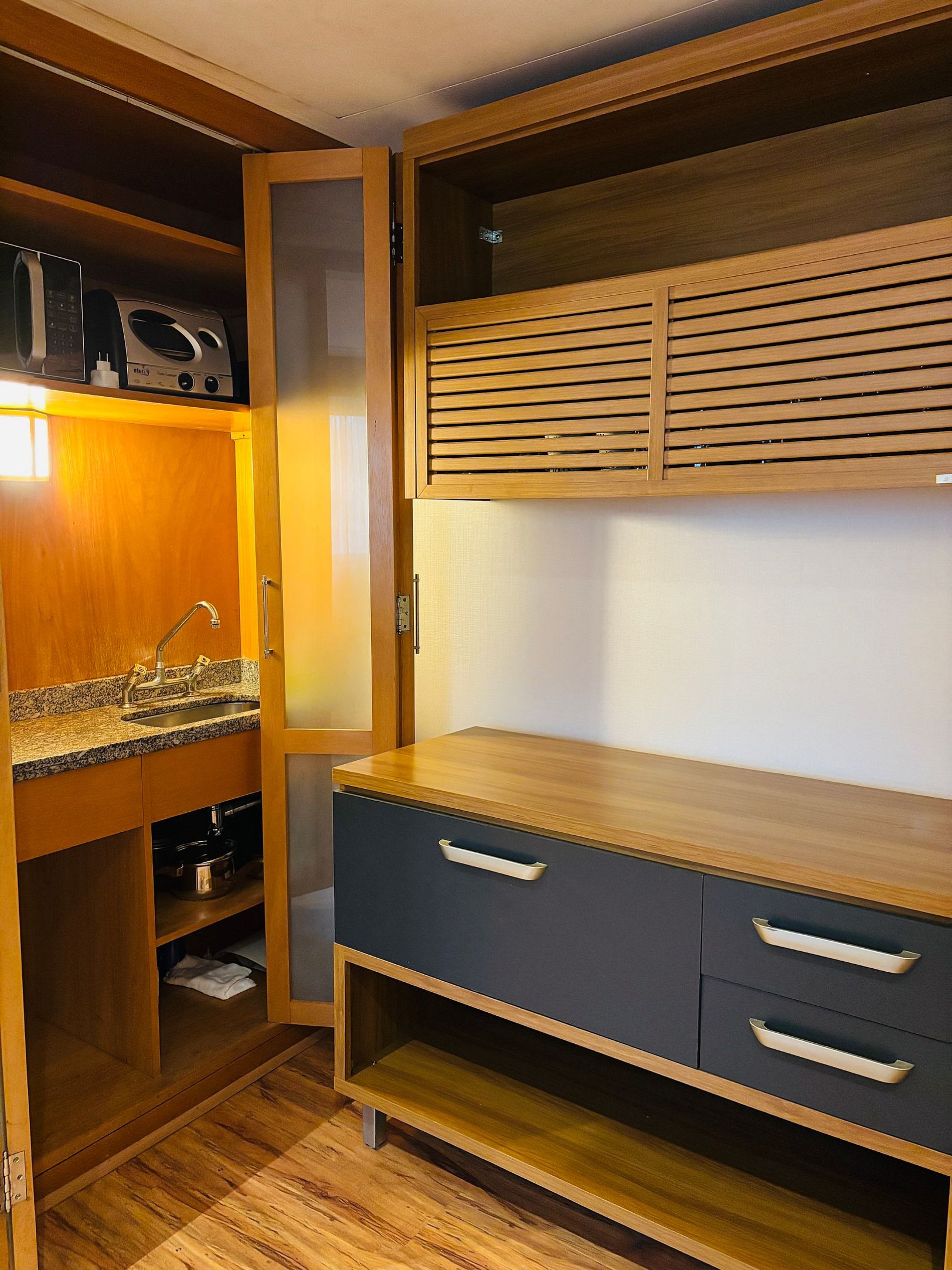 - Cozinha com micro-ondas, geladeira, cafeteira, pratos, copos e talheres