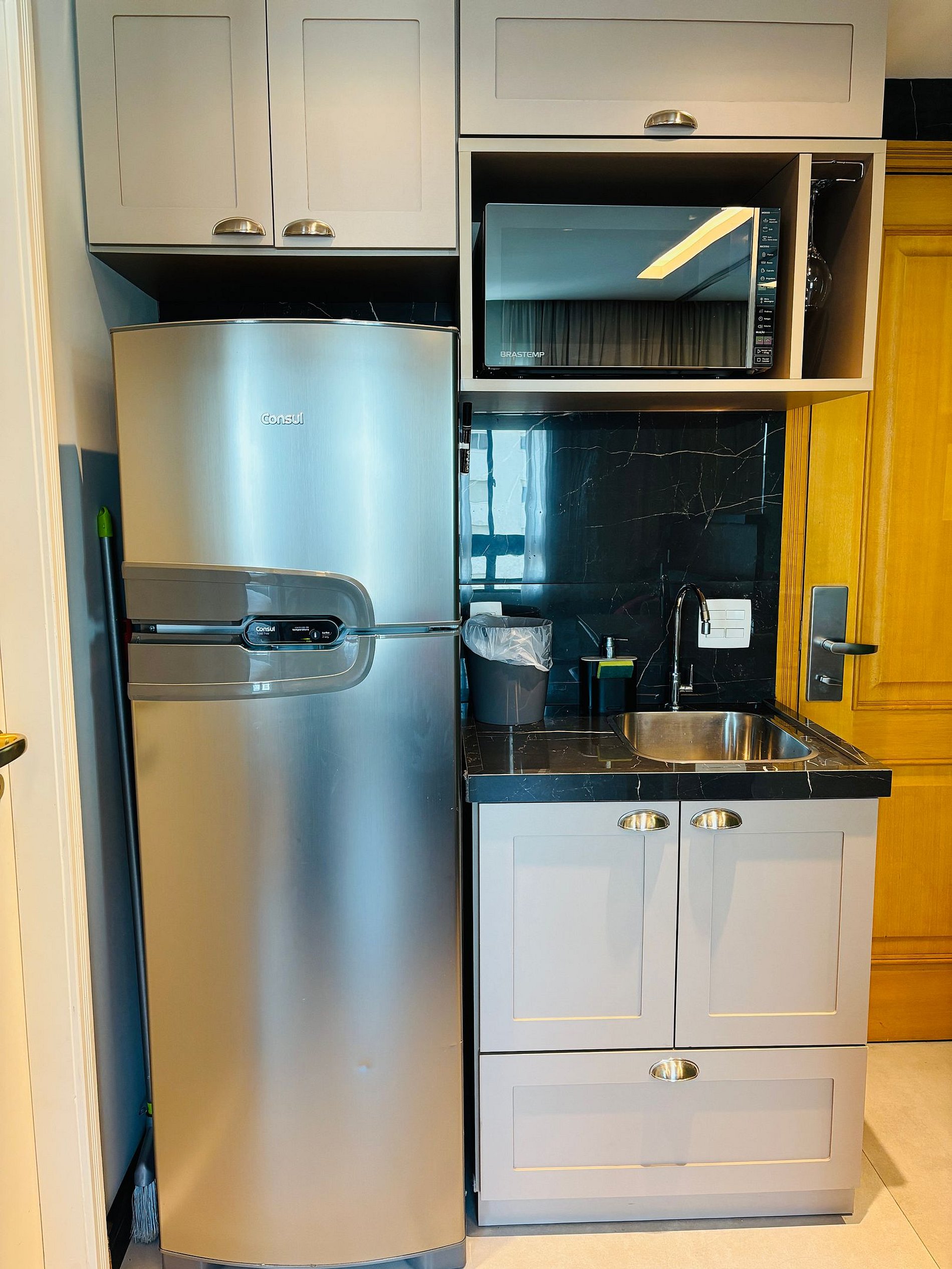 - Cozinha com micro-ondas, cafeteira, pratos, copos e talheres