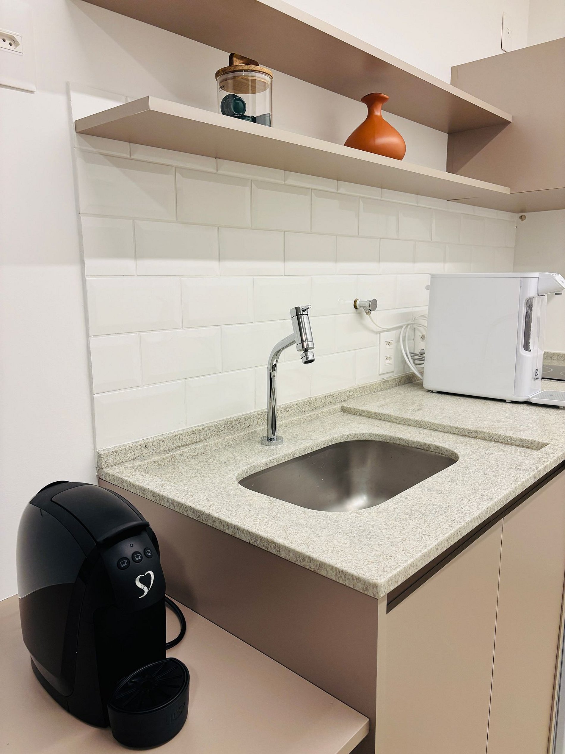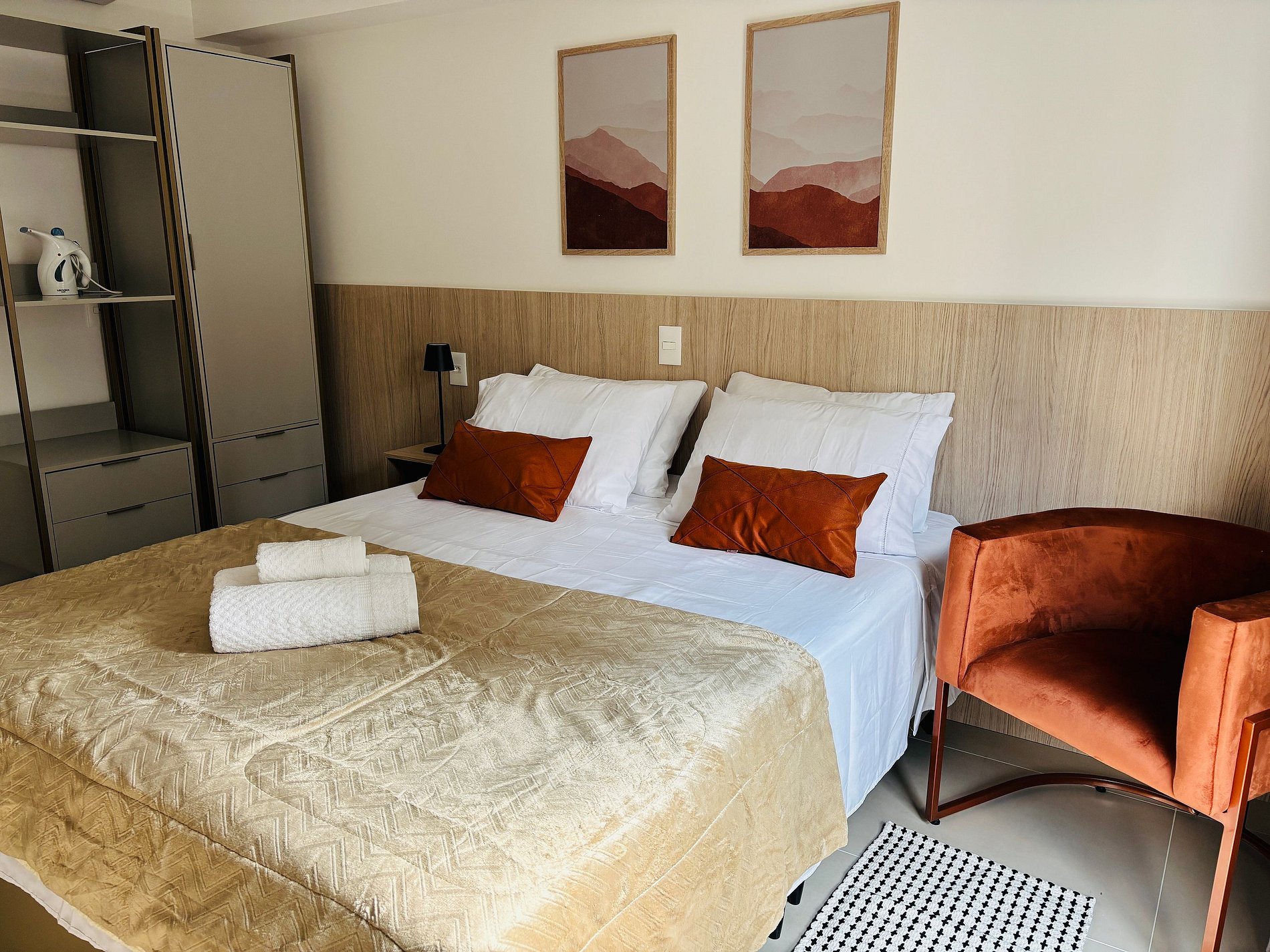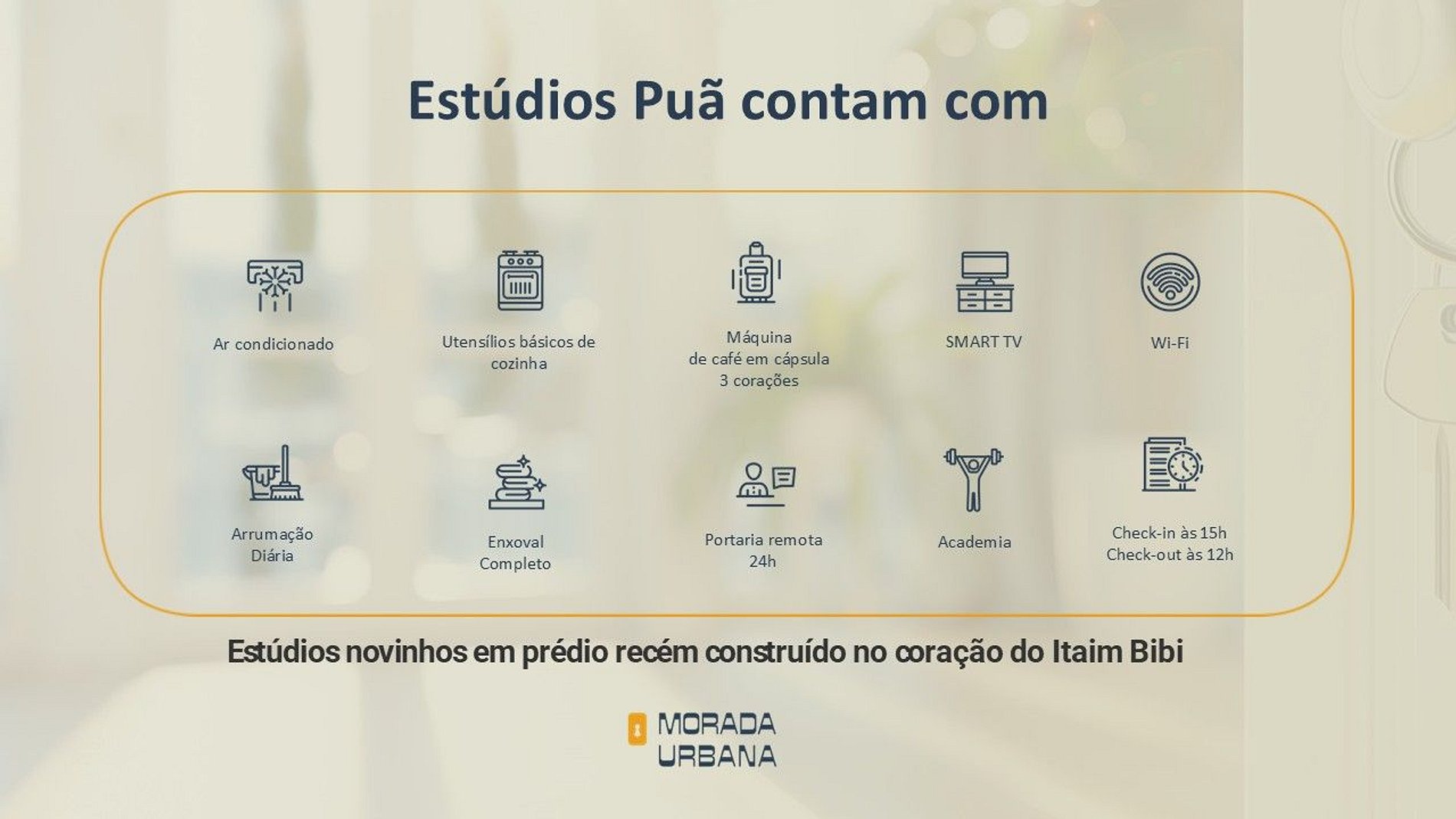 Os estúdios são equipados com cama de casal, Smart TV, Wi-Fi , ar-condicionado, secador de cabelo, steamer portátil, cozinha com mesa de apoio, micro-ondas, frigobar, fogão por indução, máquina de café em cápsula, filtro de água e louças básicas. Além disso, o condomínio possui academia e lavanderia.