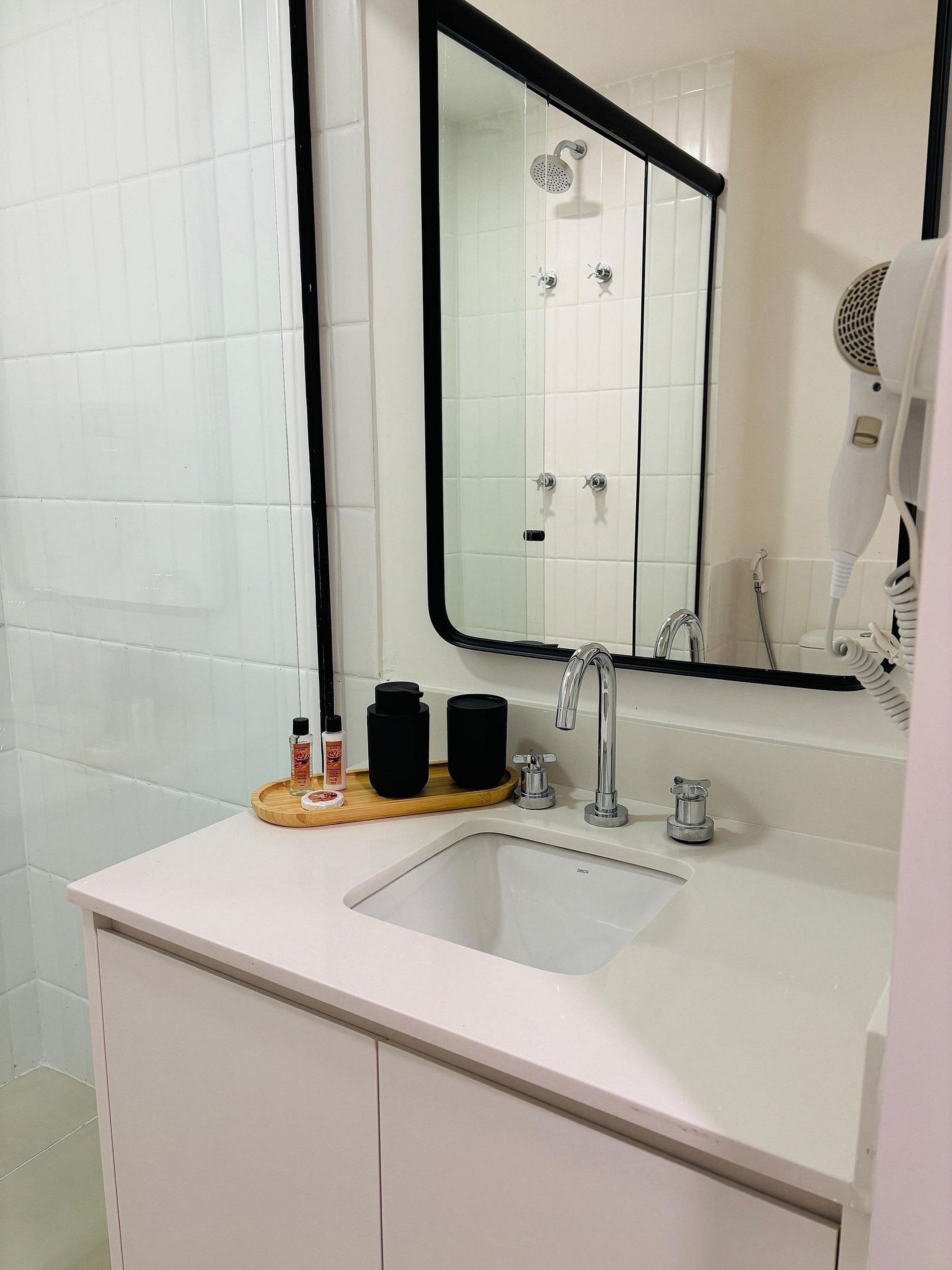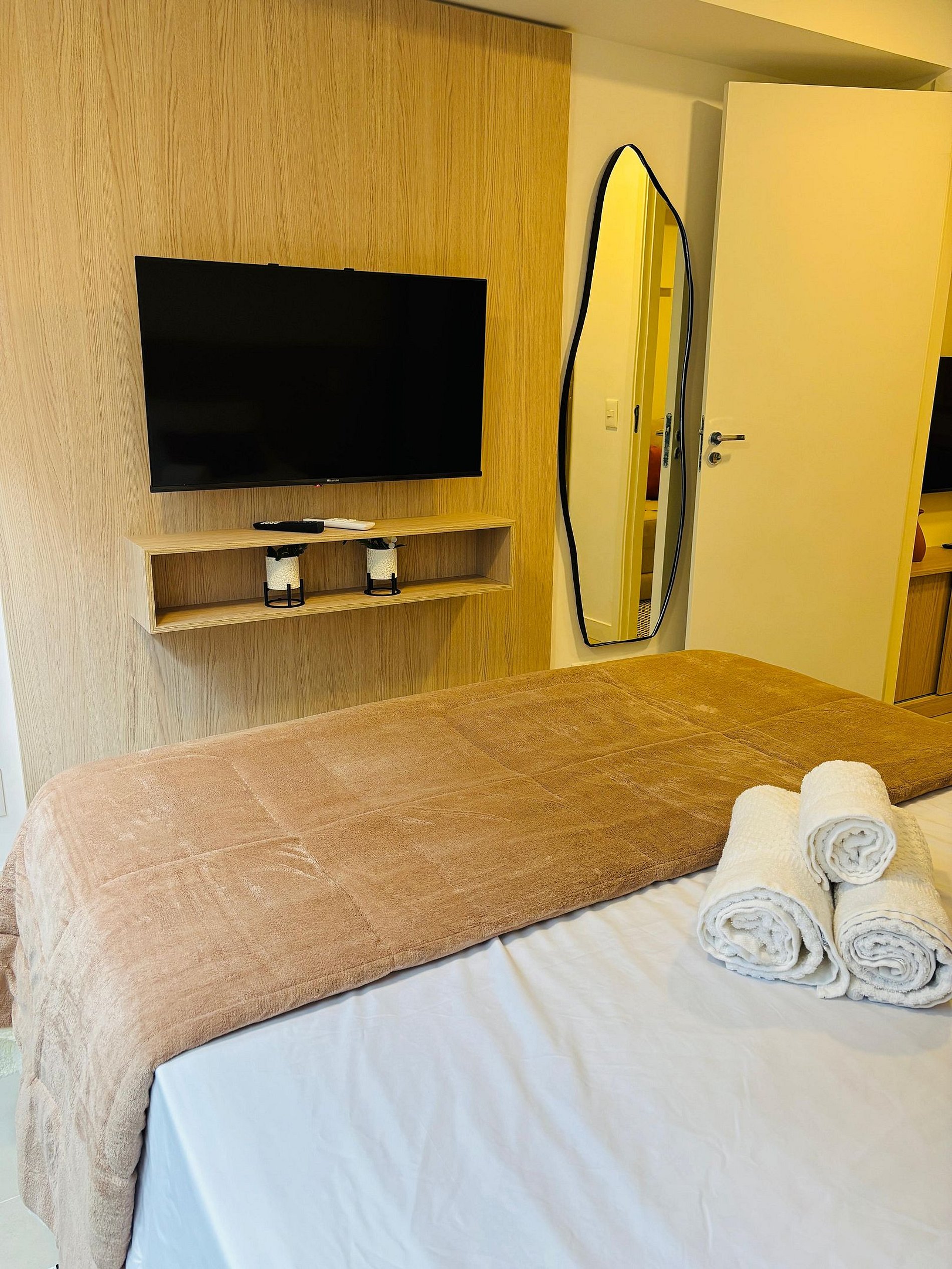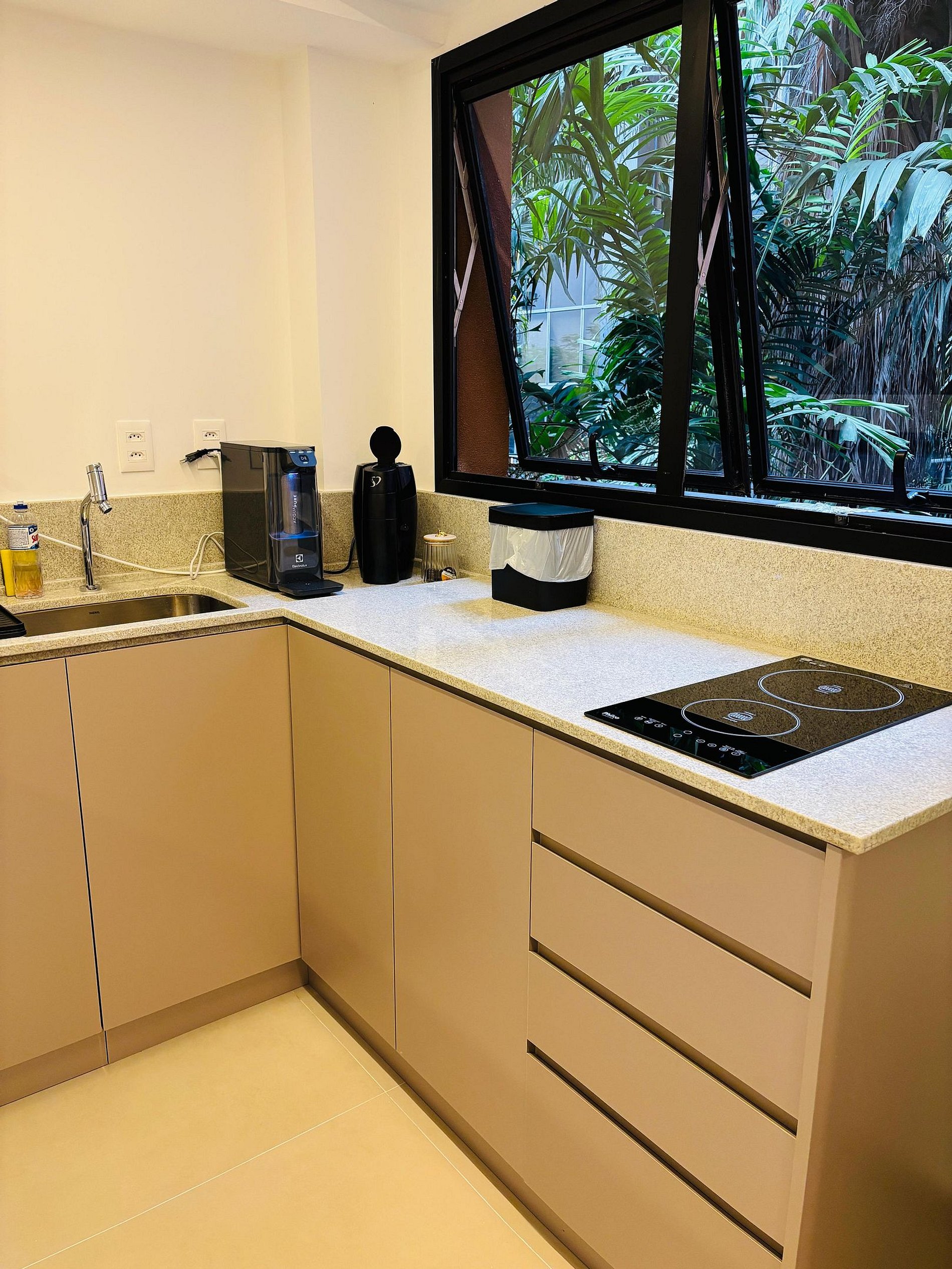 Os estúdios são equipados com cama de casal, sofá-cama, Smart TV, Wi-Fi , ar-condicionado, secador de cabelo, steamer portátil, cozinha com mesa de apoio, micro-ondas, frigobar, fogão por indução, máquina de café em cápsula, filtro de água e louças básicas. Além disso, o condomínio possui academia e lavanderia.